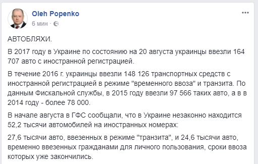 А вот Олег Попенко воздержался от эмоциональных комментариев и привел некоторые цифры. Из которых следует, что количество ввезенных на еврономерах машин в Украину с каждым годом существенно растет.