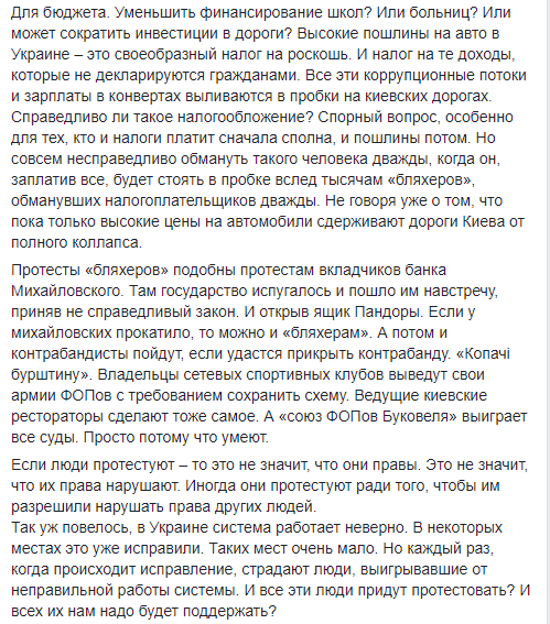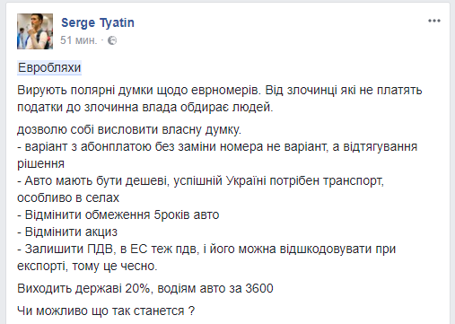 "З одного боку безконтрольний ввіз авто перетворює Україну на утилізаційний комплекс європейського неліквіду. А з іншого боку я певен, що держава повинна дати можливість розвиватись вільному ринку, який сам себе відрегулює. Держава повинна перестати займатись протекціонізмом бізнесів регіоналів Святаша і Васадзе і створювати проблеми для рядових українців. Адже ні для кого не секрет, що податкова і митна політика тих же Росії, Молдови, Бєларусі дозволяють тримати ціни на авто на достатньо низькому рівні по відношенню до України. Про США я взагалі мовчу... Введіть нормальні правила гри і всі ці "маргінали" з задоволенням пересядуть на українські номери".