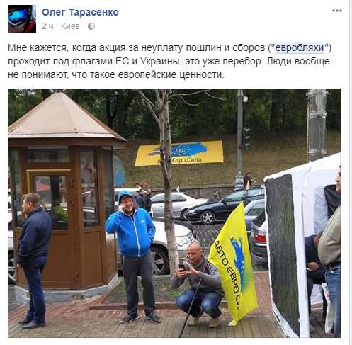 По мнению Андрея Тарасенко, когда акция за неуплату пошлин и сборов ("евробляхи") проходит под флагами ЕС и Украины, это уже перебор. "Люди вообще не понимают, что такое европейские ценности", – говорит он.