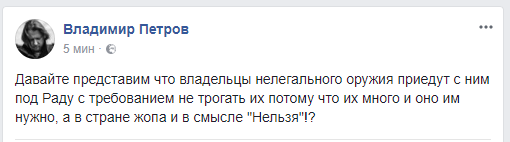 Телеведущий Владимир Петров предлагает представить, что владельцы нелегального оружия приедут под Раду с требованием не трогать их "потому что их много и оно им нужно, а в стране ж*па и в смысле "Нельзя"!?".