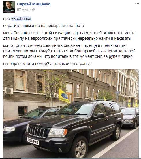 Сергей Мищенко отмечает: "Меня больше всего в этой ситуации задевает, что сбежавшего с места дтп водилу на евробляхах практически нереально найти и наказать.мало того что номер запомнить сложнее, так еще и предъявлять притензии потом к кому? к литовской-болгарской-грузинской конторе? пойди потом докажи, что водитель в тот момент был за рулем лично".