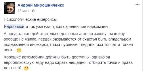 Андрей Мирошниченко считает: "Евробляхи и так уже ездят, как охреневшие наркоманы.