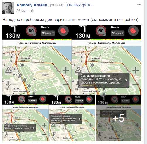 Анатолий Амелин, бизнесмен и супруг депутата Елены Сотник, выставил фото пробок на карте вместе с комментариями людей, которые ссорятся из-за "акции на бляхах". На один комментарий в поддержку владельцев еврономеров приходится десять злобных пожеланий попасть под пресс.