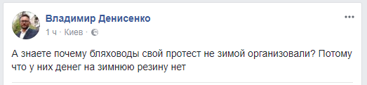 PR-директор MKK film Владимир Денисенко подметил: "А знаете почему бляховоды свой протест не зимой организовали? Потому что у них денег на зимнюю резину нет".