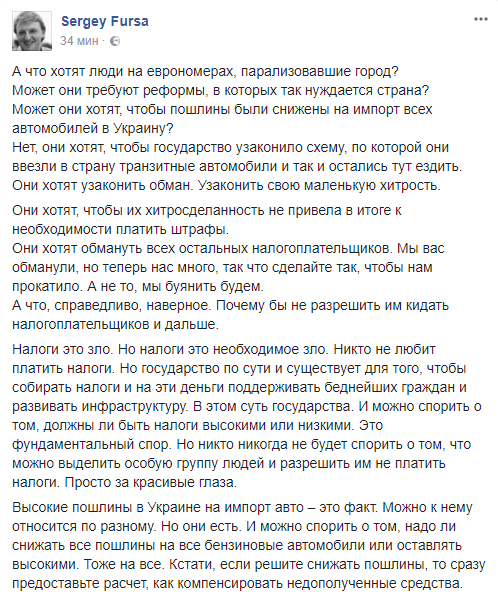 "Протесты «бляхеров» подобны протестам вкладчиков банка Михайловского. Там государство испугалось и пошло им навстречу, приняв не справедливый закон. И открыв ящик Пандоры. Если у михайловских прокатило, то можно и «бляхерам». А потом и контрабандисты пойдут, если удастся прикрыть контрабанду. «Копачі бурштину». Владельцы сетевых спортивных клубов выведут свои армии ФОПов с требованием сохранить схему. Ведущие киевские рестораторы сделают тоже самое. А «союз ФОПов Буковеля» выиграет все суды. Просто потому что умеют... Если люди протестуют – то это не значит, что они правы. Это не значит, что их права нарушают. Иногда они протестуют ради того, чтобы им разрешили нарушать права других людей", – подчеркивает Фурса.