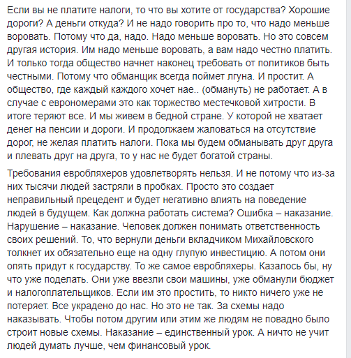 "Требования евробляхеров удовлетворять нельзя. И не потому что из-за них тысячи людей застряли в пробках. Просто это создает неправильный прецедент и будет негативно влиять на поведение людей в будущем. Как должна работать система? Ошибка – наказание. Нарушение – наказание. Человек должен понимать ответственность своих решений. То, что вернули деньги вкладчиком Михайловского толкнет их обязательно еще на одну глупую инвестицию. А потом они опять придут к государству. То же самое евробляхеры. Казалось бы, ну что уже поделать. Они уже ввезли свои машины, уже обманули бюджет и налогоплательщиков. Если им это простить, то никто ничего уже не потеряет. Все украдено до нас. Но это не так. За схемы надо наказывать. Чтобы потом другим или этим же людям не повадно было строит новые схемы. Наказание – единственный урок. А ничто не учит людей думать лучше, чем финансовый урок", – считает Фурса.