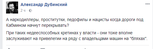 В похожем духе выразился и журналист Александр Дубинский: А наркодиллеры, проститутки, педофилы и нацисты когда дороги под Кабмином начнут перекрывать? При таких недееспособных кретинах у власти - они тоже вполне заслуживают на привелегии на ряду с владельцами машин на "бляхах".