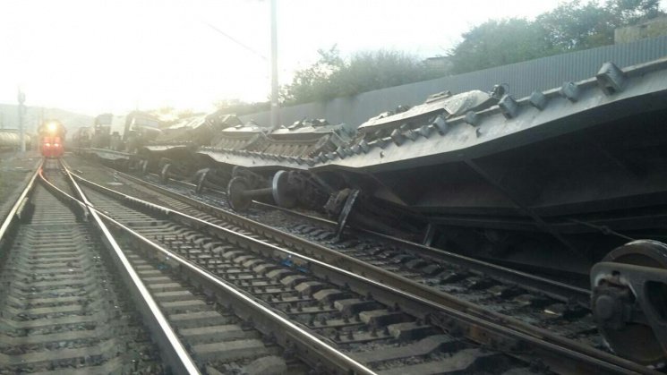 По предварительным данным, во время движения перевернулись 11 грузовых платформ военного поезда, а также три вагона сопровождения.