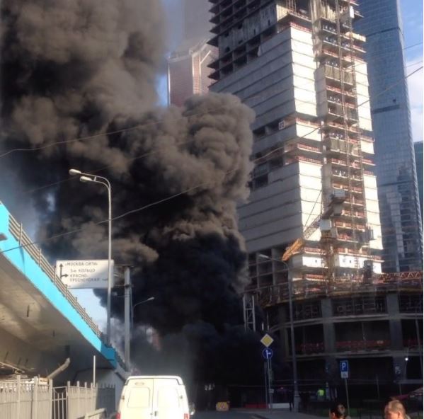 От конструкции поднимаются клубы густого черного дыма. На место прибыли пожарные расчеты, подъезды к дороге около "Москва-Сити" ограничены.
