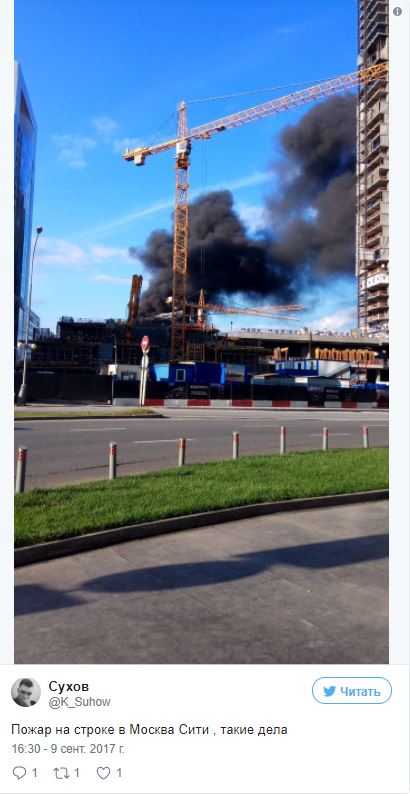 В Москве начался сильный пожар в районе строящегося небоскрёба Neva Towers. От конструкции поднимаются клубы густого чёрного дыма.