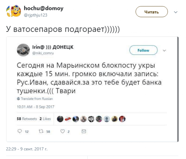Так, одна из поклонниц «ДНР» сообщает: «Сегодня на въезде в Донецк возле «Моста» людей выводили из автобуса, отбирали колбасы, мясо и все кидали в машину. Люди, но это же мерзко («.
