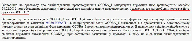 Проте суд визнав Невідомого І.К. невинним, оскільки, за його поясненнями, за кермом був не він, … а його дружина.
