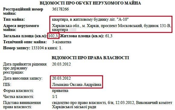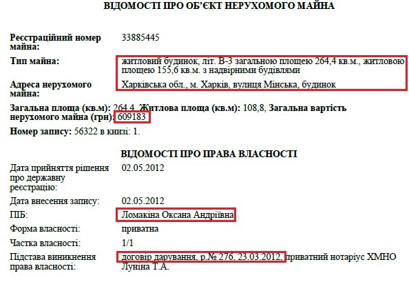 Більшість свого майна Оксана Ломакіна отримала у 2012 році. Зокрема, у березні їй подарували будинок-таунхаус на 264 м² у Харкові та землю під ним площею 42,3 м². Вказана вартість цього майна – 828 тис. грн, що більш ніж 100 тис. дол на той час.