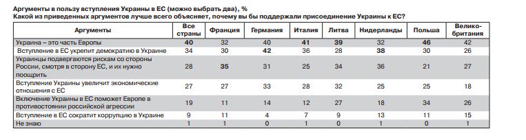 С другой стороны, респонденты понимают, что Украина — это часть Европы, предполагают, что вступление в ЕС может усилить демократию в Украине, поощрит украинцев в конфликте с Россией и усилит экономические отношения с Брюсселем.