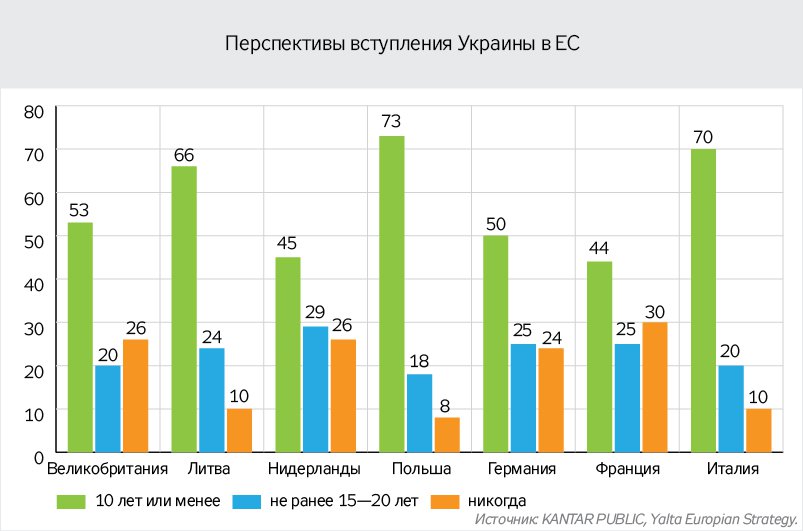 Несмотря на то, что более половины жителей Европы против интеграции Украины в Евросоюз, большая часть опрошенных европейцев считает, что этот процесс завершится в течение ближайших десяти лет. Однако некоторые респонденты уверены, что Украина никогда не станет полноценным членом ЕС.