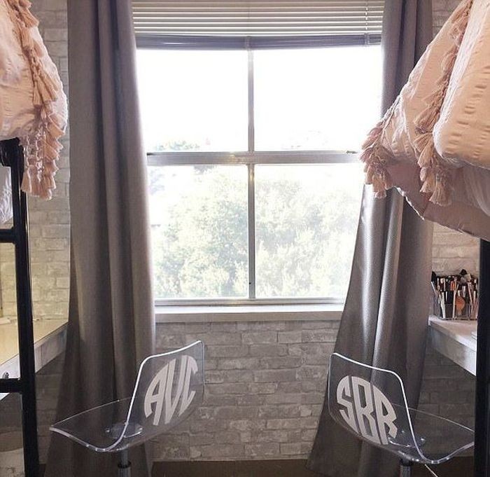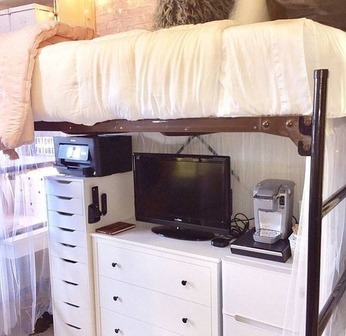 Грамотное использование небольшого пространства, позволило вместить белые комоды, столы под мрамор, телевизор и небольшой холодильник. Теперь стандартная студенческая комната больше напоминает люксовый номер отеля.