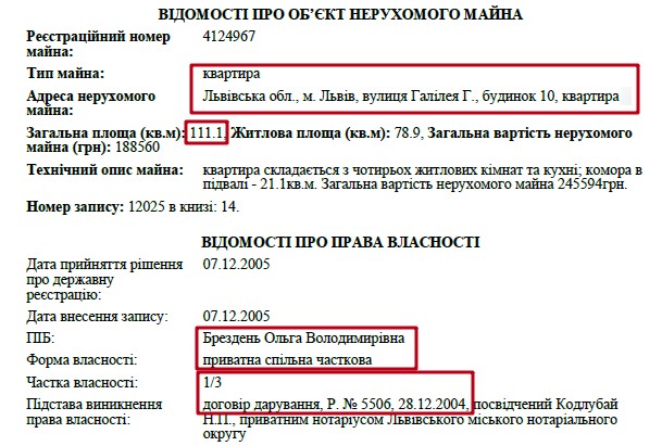 У частковій власності дочки прокурора Ольги Володимирівни Брездень перебуває квартира на 111 м² за адресою: вулиця Галілея, 10. Саме за цією адресою як адвокат зареєстрований Володимир Брездень. Утім, хоча прокурор і користується квартирою своєї дочки, в декларації за 2016 рік це житло відсутнє.