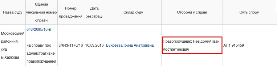 Согласно данным Реестра судебных решений, в марте 2016 года именно на таком автомобиле был остановлен гражданин Невидомый Иван Константинович с признаками состояния алкогольного опьянения, о чем составлен протокол с участием двух свидетелей. Согласно данным патрульных, водитель отказался от прохождения освидетельствования на состояние опьянения.