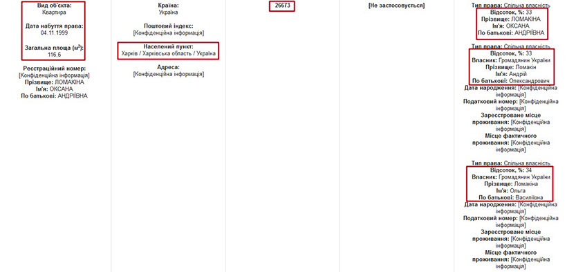 Муж Оксаны Ломакиной имеет в собственности только «навес с погребом на земельном участке сельского совета» в с. Одрынка, что в Харьковской области. Его площадь - 1627 м². Похоже, что именно под этим навесом прокурор и живет, ведь иного имущества или права пользованием имуществом его жены он не имеет. Кстати, это является нарушением правил декларирования, и соответствующие органы должны дать этому оценку.