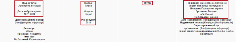 Право пользования автомобилем Skoda Rapid 2014 года выпуска имеет муж Иван Невидомый. Владельцем авто является мать прокурора, которая приобрела его в 2014 году. Указанная стоимость автомобиля - 254 тыс. грн.