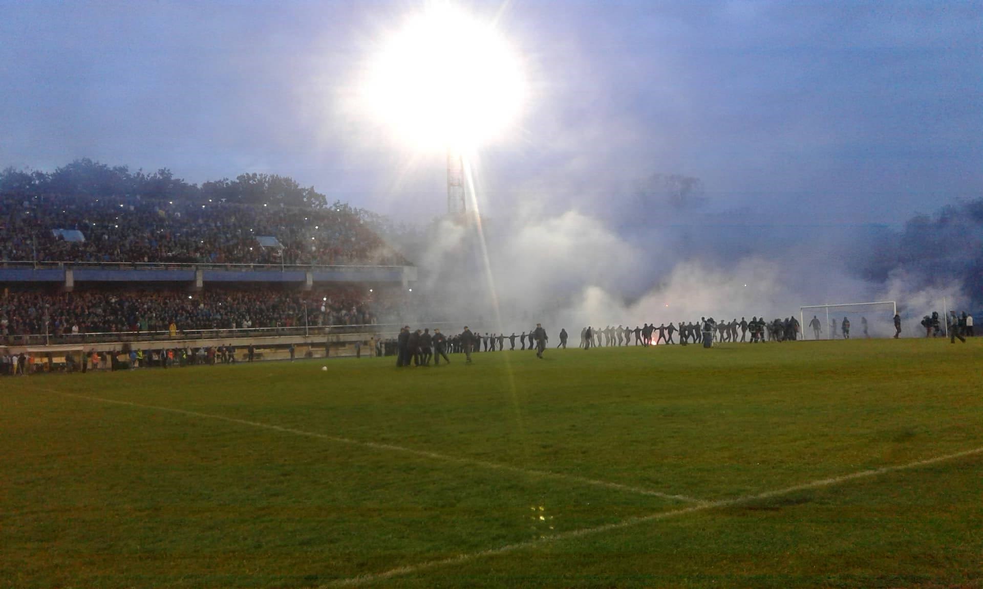 Перед перерывом хозяева открыли счет в матче, после чего ультрас "Карпат" зажгли пиротехнику и поле покрыл густой дым. Сперва игру пришлось приостановить, однако в на 62-й минуте "Прикарпатье" забило второй мяч. Разозленные фанаты "зелено-белых" прорвались с файерами на поле, устроив беспорядки.