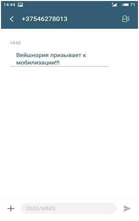 В первые дни учений, в разных социальных сетях граждане Беларуси начали массово жаловаться на непонятные SMS-сообщение, которые они получали от неизвестных абонентов. В SMS-ках писалось: «Вейшнория призывает к мобилизации», «Вейшнория призывает! Мобилизируйся», «Вейшнория от Гродно до Полоцка» и другие подобные призывы. Адресаты этих сообщений, судя по их профилям в соцсетях, были случайными и никак не связанными друг с другом людьми. Поэтому, вероятней всего, рассылка происходила по территориальному принципу – людям, которые живут на территории условной Вейшнории. Российские специалисты информационных операций любят и широко практикуют подобные приемы. В частности, они массово рассылали SMS-сообщения, направленные на деморализацию и провокацию украинских военнослужащих во время конфликта на Донбассе в 2014-2017 годах. И только российские пропагандисты могут это осуществить на территории Беларуси.