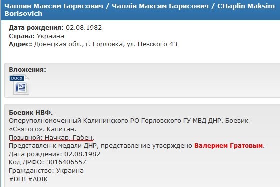 В частности, террорист Максим Чаплин с позывными "Начкар" и "Габен" был родом из Горловки Донецкой области.
