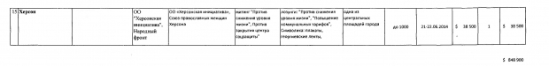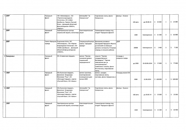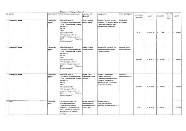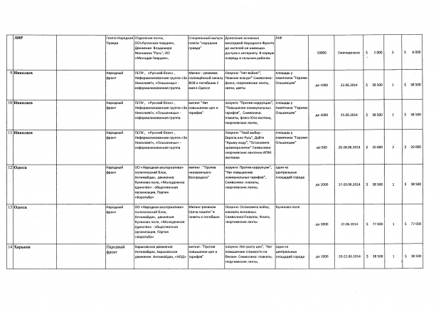 Второй документ, подтверждающий финансирование «новороссийского» царька российскими кукловодами, - список мероприятий на две последние недели июня, к которым «лидер» приложил руку и кремлевские деньги. Митинги с количеством участников от 200 до 3 тысяч человек в Днепропетровске, Запорожье, Херсоне, Николаеве и Одессе, планировалось проводить по самым разным поводам. Для личного обогащения Царев и Ко не гнушались ничем и готовы были паразитировать своей «Новороссией» и «Народным кордоном» на пикетах «Матери против войны» или акциях «Нет повышению цен и тарифов». При этом суммы затрат на «организацию» мероприятий колебались от 15 тыс долларов до 77 тыс долларов.