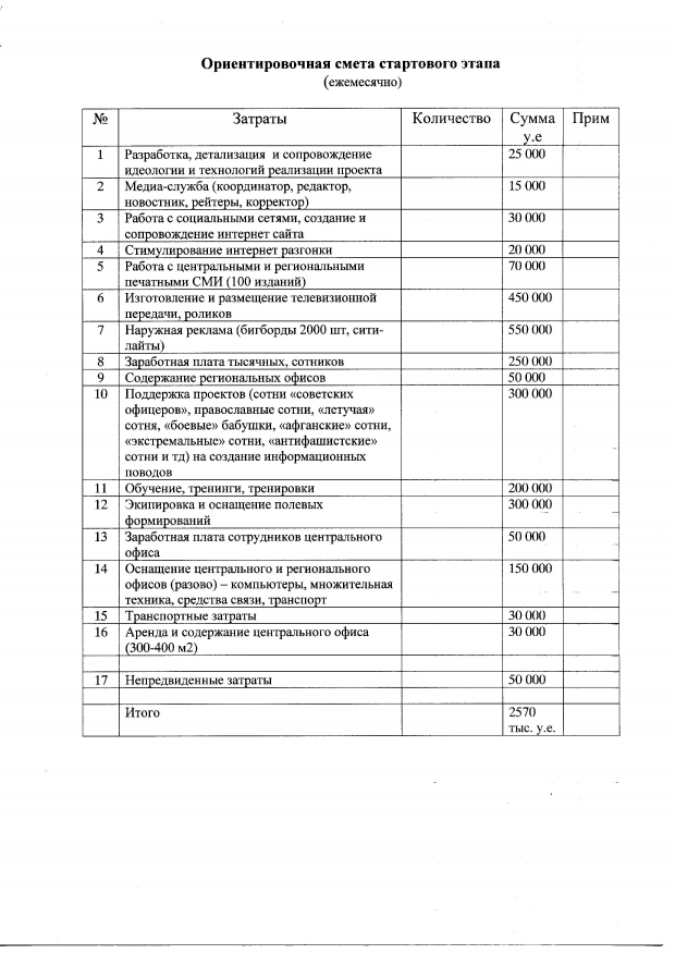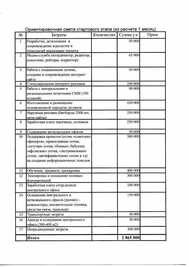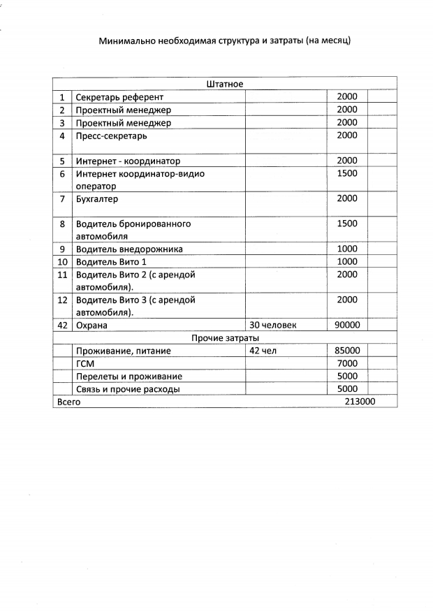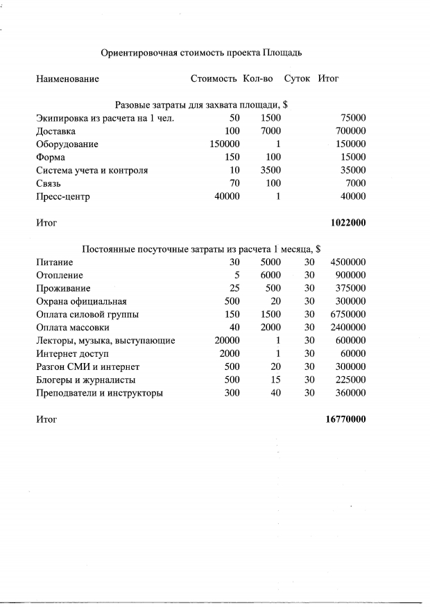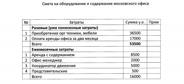 Согласно смете разовые (уже понесенные затраты – сказано в документе) составили 17 тысяч долларов – оплата аренды за 2 месяца, а также приобретение оргтехники и мебели – 36,5 тысяч долларов. В дальнейшем ежемесячные расходы на «штаб» в Москве были таковы: аренда – 8,5 тыс, офис-менеджер – 2 тыс, координатор движения – 5 тыс, представительские расходы – 500 долларов.