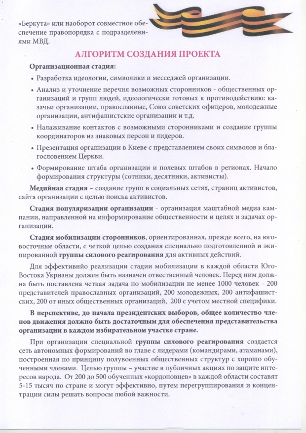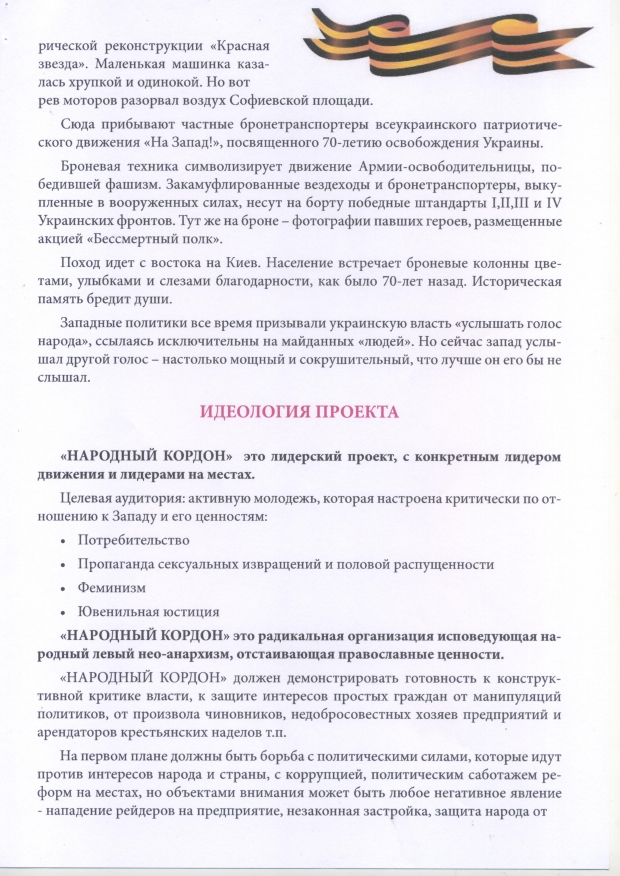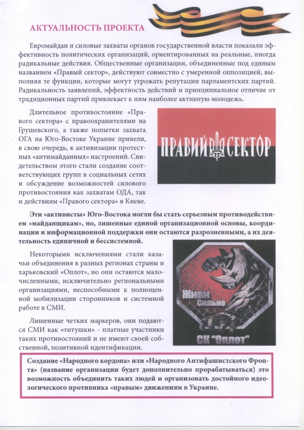 Идея уместилась на восьми страницах печатного текста. Суть ее – взяв за основу «активистов» Антимайдана, объединив их необходимостью противостояния «майданщикам» и сделав серьезные финансовые вливания (на экипировку, раскрутку в СМИ, оплату акций «протеста», и даже вооружение, вплоть до бронетехники), создать организацию «Народный кордон» (альтернативное название – «Народный антифашистский фронт») по принципу «Правого сектора».
