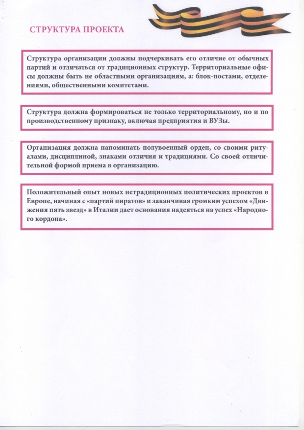 Чего только стоит утверждение, что «Народный кордон» должен напоминать «полувоенный орден, со своими ритуалами, дисциплиной, знаками отличия и традициями, со своей отличительной формой приема в организацию». Или намерение перенять «положительный опыт новых нетрадиционных политических проектов в Европе, начиная с «партий пиратов» и заканчивая громким успехом «Движения пять звезд» в Италии».