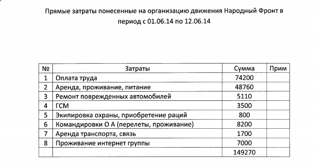 Какой из вариантов сметы был в результате утвержден в Кремле, в настоящее время сказать трудно. Но денег Цареву снова дали. Об этом, в частности, свидетельствуют два документа, которые имеются в материалах уголовного производства. Первый – прямые затраты, понесенные на организацию сепаратисткого движения в период с 1 июня по 12 июня.