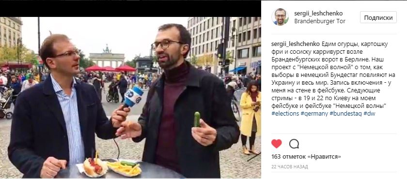 "Едим огурцы, картошку фри и сосиску карривурст возле Брандебурских ворот в Берлине", - написал Лещенко в своем фотоблоге.