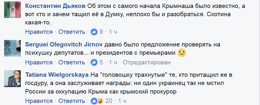 "На "головушку трахнутые" те, кто притащил ее в Госдуру, а она заслуживает награды: ни один украинец так не мстил России за оккупацию Крыма как крымский прокурор"; "Грешно над болезными смеяться"; "После "бюст замироточил" как бы и сомнений не было".