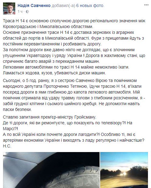 Савченко ехала по трассе "Н-14" во вторник около пяти утра 26 сентября вместе с сестрой Верой и помощником нардепа Проторченко Татьяной. Автомобиль попал в яму глубиной до капота легковой машины. В результате аварии Проторченко получила трамву головы с глубоким разсечением, сама Савченко - забой грудной клетки и шейного позвонка.