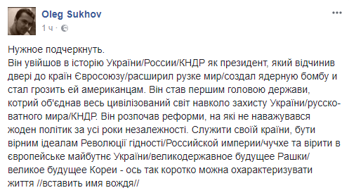 Олег Сухов, журналист: "Нужное подчеркнуть. Він увійшов в історію України/России/КНДР як президент, який відчинив двері до країн Євросоюзу/расширил рузке мир/создал ядерную бомбу и стал грозить ей американцам. Він став першим головою держави, котрий об’єднав весь цивілізований світ навколо захисту України/русско-ватного мира/КНДР. Він розпочав реформи, на які не наважувався жоден політик за усі роки незалежності. Служити своїй країни, бути вірним ідеалам Революції гідності/Российской империи/чучхе та вірити в європейське майбутнє України/великодержавное будущее Рашки/великое будущее Кореи - ось так коротко можна охарактеризувати життя //вставить имя вождя//"