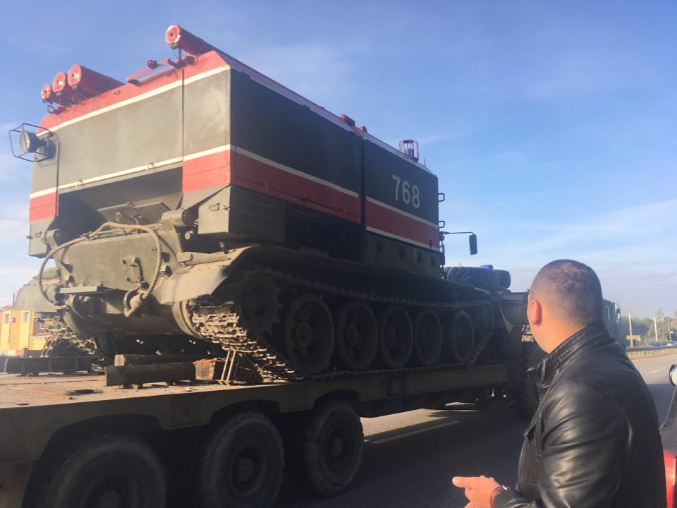 Был замечен пожарный танк на базе Т-55. Это огромный водомет дальностью подачи водяной струи 100 метров.