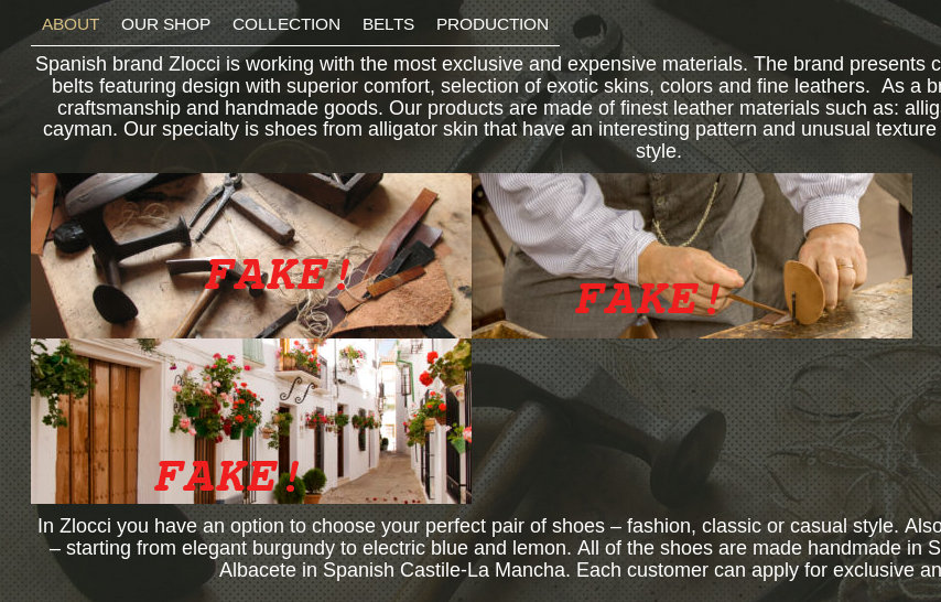 Впрочем, давайте не забегать наперед. Лишь на секунду задумаемся, перед тем как покупать крокодиловы шлепанцы и оценим, насколько далеко зашли создатели Злоччи в своей откровенной лжи. Сайт Zlocci.com исключительно приятен тем, что может сразу ответить на этот вопрос Made in: никаких мастерских в Испании нет. Скорее всего есть какие-то мутные подвалы с рабами из Азии, которые и шьют указанную обувь. О том, что это так Злочевский намекает нам лично. Предоставляя поддельные фотографии своего производства и инструментов. Фотографии якобы испанской мастерских, опубликованные на сайте Zlocci (http://www.zlocci.com/ru/production/) целиком и полностью поддельные, ворованные и отредактированные при помощи Photoshop. Убедиться в этом может любой мало-мальски грамотный человек (коих, мы искренне верим, в Москве найдется не мало).