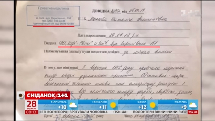 28 сентября 2017 года вышел в эфир сюжет на телеканале «1+1», в котором журналисты показали медицинскую справку, которая якобы была выписана Наталье Макеевой. Однако после проверки указанной клиники в ЕДРПОУ выяснилось, что такого предприятия попросту не существует.