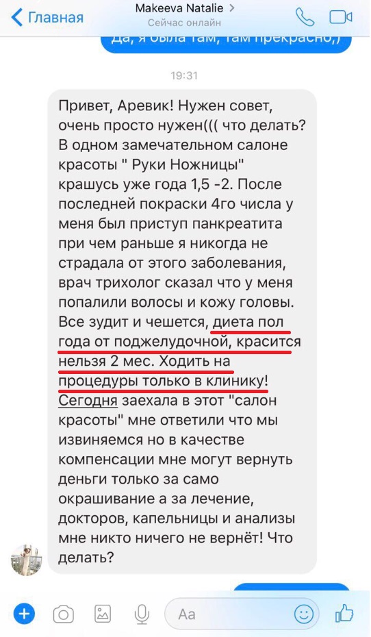 Эта информация меньше всего вяжется со словами самой Макеевой о повреждении волос и болезнях. В переписке со своей подругой, известной блогершой Аревик Арзумановой, она пишет о том, что врач-трихолог прописал ей строгую диету, долгий курс лечения и чуть-ли не постельный режим на ближайшие два месяца.