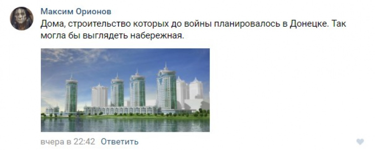 Пользователь Максим Орион сетует, что строительство красивых домов на набережной в центре Донецка прервала война.
