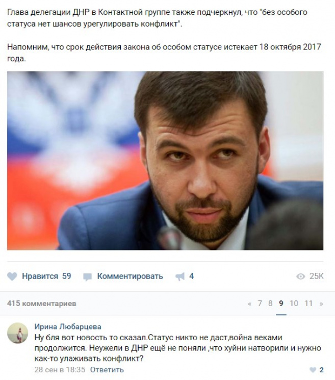 «Ну б…ь, вот новость то сказал. Статус никто не даст, война веками продлится. Неужели в «ДНР» еще не поняли, что натворили… и что необходимо как-то улаживать конфликт?» — комментирует высказывание одного из главарей «ДНР» Дениса Пушилина Владимировича жительница Волновахи Ирина Любарцева.