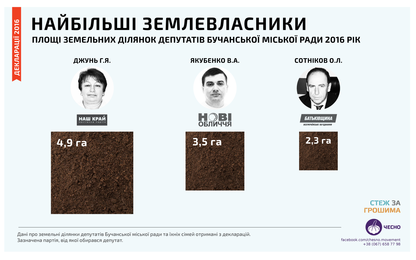 3,5 га задекларував депутат від партії “Нові обличчя” Віталій Якубенко. Земля депутата розташована у Бучі.