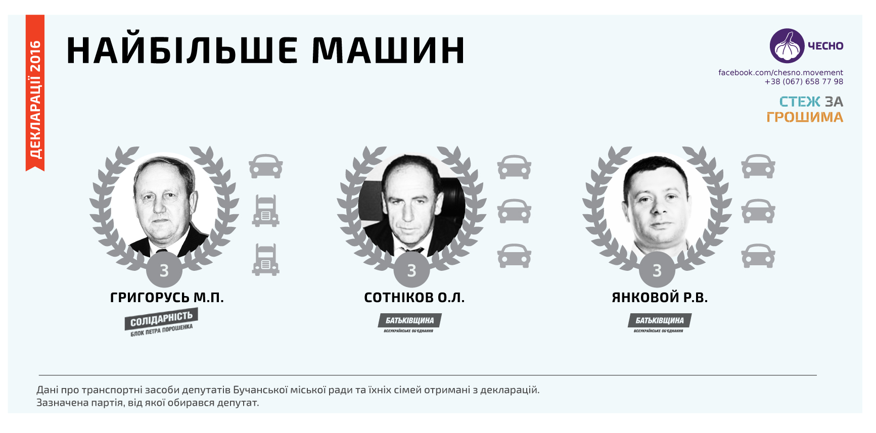 Загалом, Бучанська рада не багата на автолюбителів. Лише троє депутатів можуть претендувати на лідерські позиції автовласників, оскільки мають по три автівки.