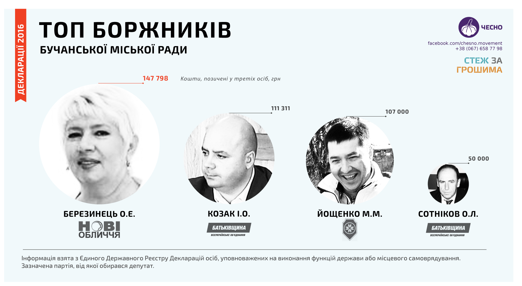 Нагадаємо, Громадський рух ЧЕСНО вже проаналізував декларації депутатів Ірпінської та Бучанської міських рад й визначив найбагатших за статками й доходами. Також аналіз декларацій Гостомельськоїта Ворзельської рад показав, хто з депутатів найбагатший, а хто потрапив до злиднів.