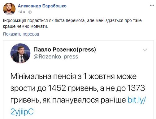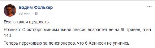 Вадим Фолькер, журналист: "*** какая щедрость. Розенко: С октября минимальная пенсия возрастет не на 60 гривен, а на 140. Теперь переживаю за пенсионеров, что б Хеннеси не упились".