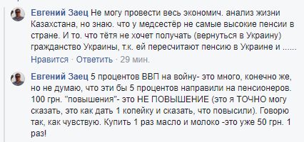 Евгений Заец, журналист: "Я понимаю, что это повышение, но у мамы в Украине 1546 грн, у тёти (её сестры, медсестра бывшая) в Казахстане 4600 грн. Повышение пенсий на 100 - 400 грн это просто стыдно".