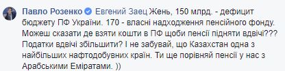 Розенко на это написал: "150 млрд. - дефицит бюджета ПФ Украины. 170 - собственные поступления пенсионного фонда. Можешь сказать где взять средства в ПФ чтобы пенсии поднять вдвое??? Налоги вдвое увеличить? И не забывай, что Казахстан одна из крупнейших нефтедобывающих стран. Ты сравни пенсии у нас с Арабскими Эмиратами".
