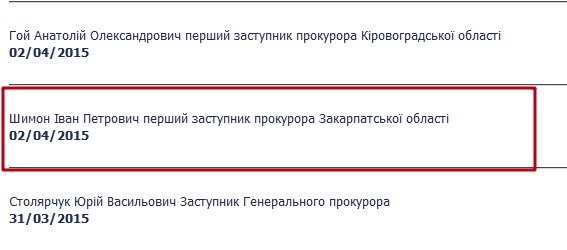Як бачимо, Іван Шимон протягом тривалого часу працював на керівних посадах у часи Віктора Януковича. З цієї причини він автоматично підлягав люстрації. Однак цього не сталося, натомість 2 квітня 2015 року Івана Шимона призначено першим заступником прокурора Закарпатської області, де він працює і сьогодні.