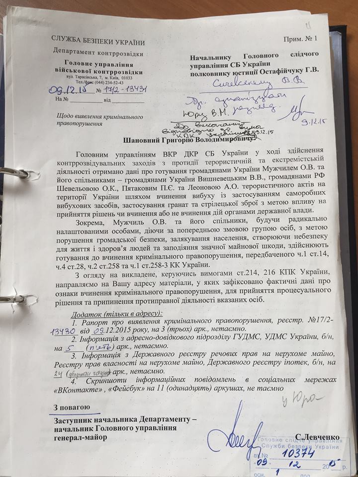 Предлагаю вашему вниманию письмо начальника ГУ ВКР СБУ Сергея Левченко на имя начальника Главного следственного управления СБУ Остафийчука Г. В. от 9 декабря 2015 года, из которого вполне очевидно, что Служба безопасности Украины готовилась к подобному развитию событий.